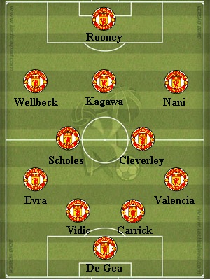 Pensando em colocar o japonês Kagawa no meio do campo e para não jogar van Persie nas pontas, uma outra formação, muito menos provável, seria a 4-1-2-1-2, com Carrick como primeiro volante, Giggs e Scholes nas meias esquerda e direita, respectivamente e o japonês armando, assim como jogava a equipe do Milan – Gatusso, Pirlo, Seedorf e Kaká – e assim, os laterais Rafael e Evra seriam ainda mais apoiadores, descartando as funções dos wingers Nani, Young e Valencia.